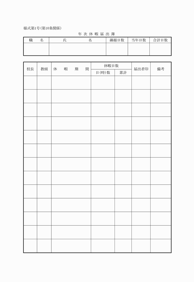 第10条 職員は、年次休暇を受けようとするときは、その前日までに年次休暇届出簿(様式第1号)により校長に届け出なければならない。