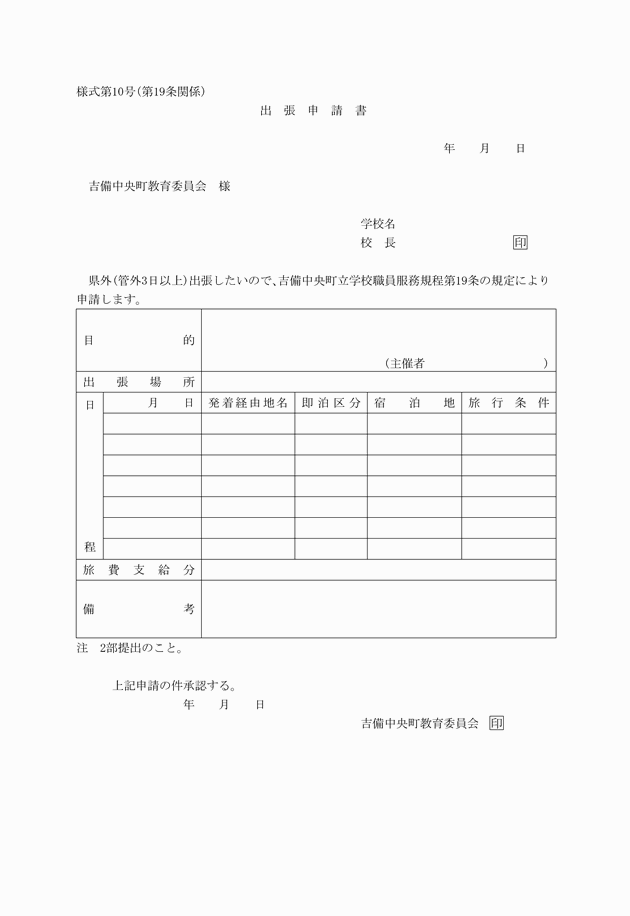 第19条 校長が、県外又は3日以上にわたり県内(管内を除く。)出張をするときは、あらかじめ出張申請書(様式第10号)により委員会の承認を受けなければならない。