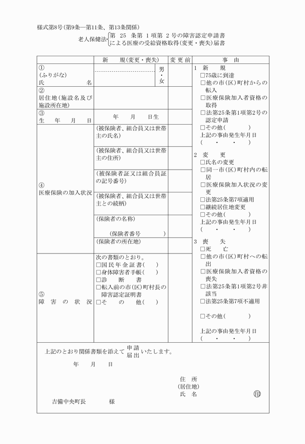 第9条 老人保健法第25条第1項第2号の障害認定申請書(様式第8号。以下「障害認定申請書」という。)により施行規則第1条に規定する障害認定の申請を受けたときは、次により処理するものとする。