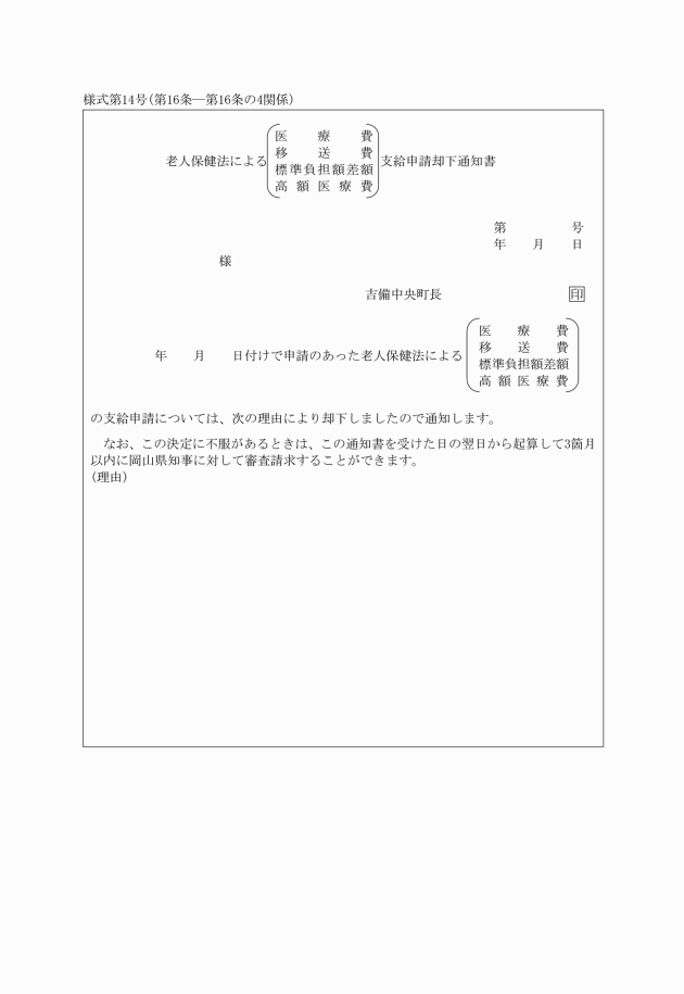 ア 老人保健法による医療費支給申請却下通知書(様式第14号)を作成し、申請者に通知すること。