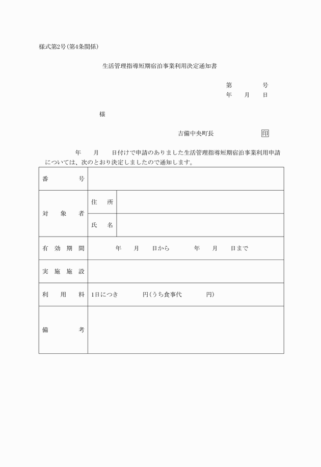 3 町長は、利用申請が適当でないと認めたときは、生活管理指導短期宿泊事業利用却下通知書(様式第4号)により申請者に通知するものとする。
