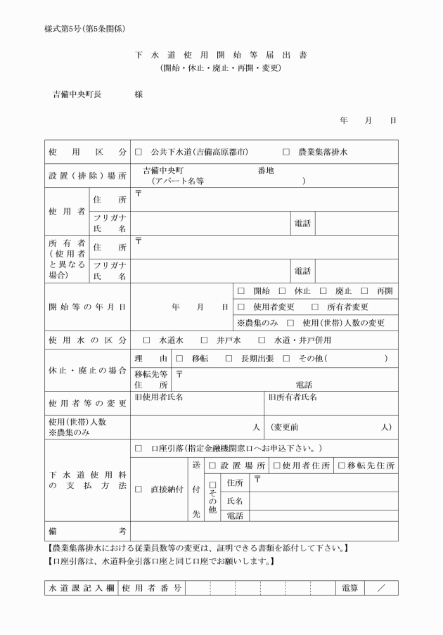 (2) 住民登録者で1ヶ月以上の長期不在者がある場合は、その旨を証明できる書類等を添付して、農業集落排水処理施設使用料算定人数変更承認申請書(様式第8号)の提出により、町長が承認した算定人数とする。