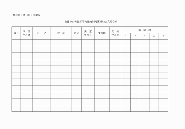 第8条 町長は、補助金の支給状況を明らかにするため、吉備中央町医師等確保特別対策補助金支給台帳(様式第8号)を備え、常に整理しなければならない。