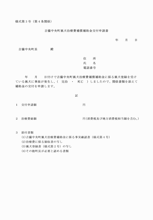 第4条 補助金の交付を受けようとする者(以下「申請者」という。)は、猟犬が完治又は死亡した後、吉備中央町猟犬治療費補償補助金交付申請書(様式第3号)に、次に掲げる書類を添えて町長に提出しなければならない。ただし、1事故につき1申請までとする。